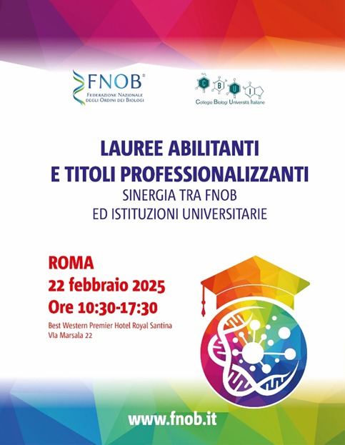 Sabato 22 febbraio 2025, l'Ordine dei Biologi del Piemonte, della Liguria e della Valle d'Aosta ha partecipato all'evento organizzato dalla Federazione Nazionale degli Ordini dei Biologi (FNOB), dal Collegio Biologi Università Italiane (CBUI) e dal Consiglio Universitario Nazionale (CUN), dal titolo “Lauree abilitanti e titoli professionalizzanti. Sinergia tra FNOB ed istituzioni universitarie”.
